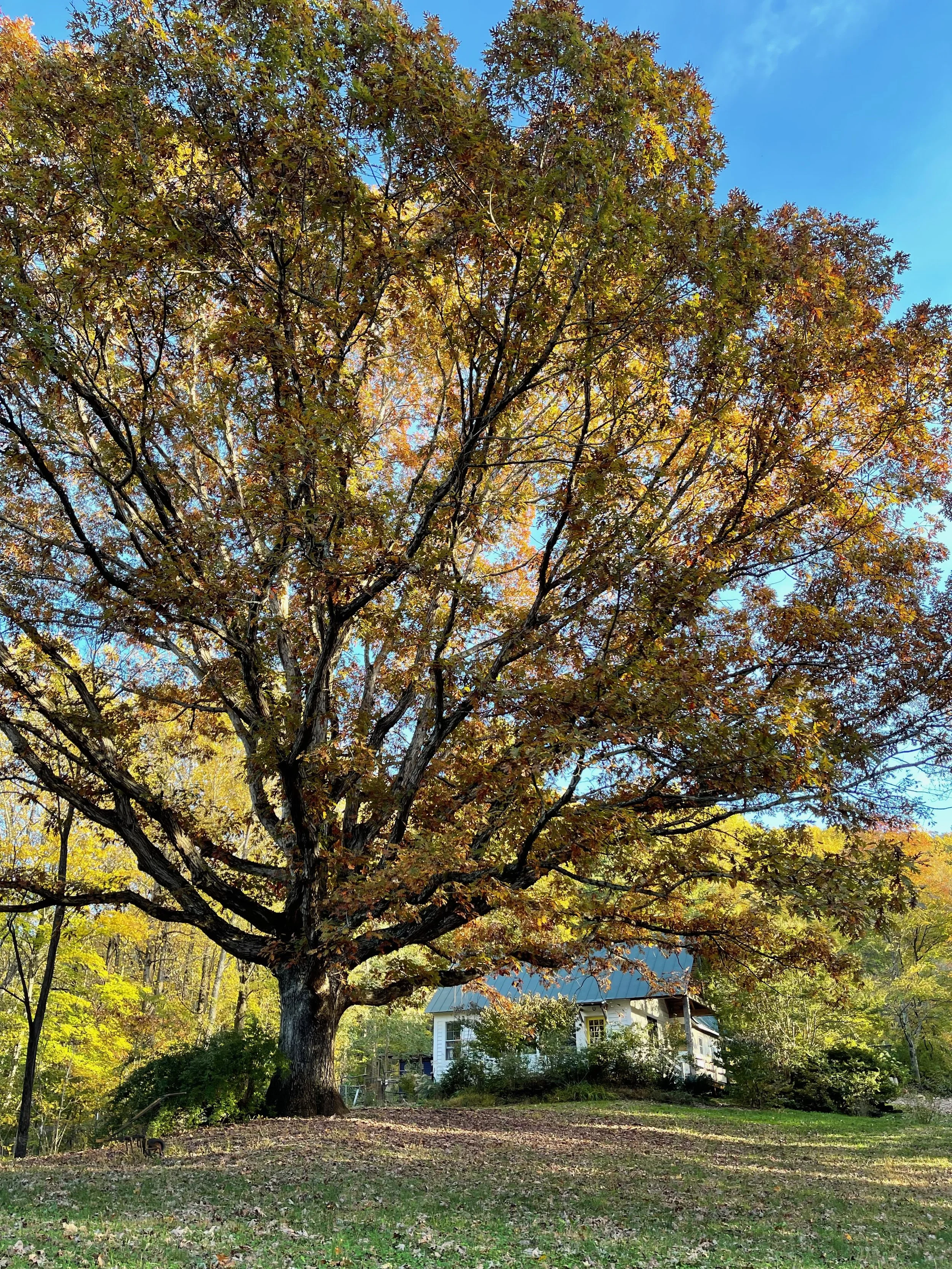 Mountain Views, majestic oak tree, miniature goats and regular sized chickens.